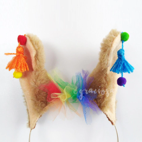 Balaca con orejitas de llama en color marrón claro, adornada con borlas, mini pompones y tul en colores arcoíris.